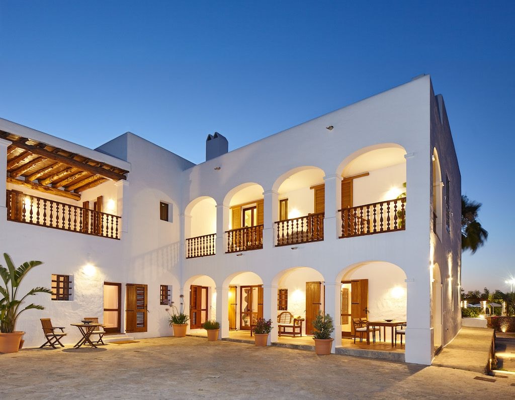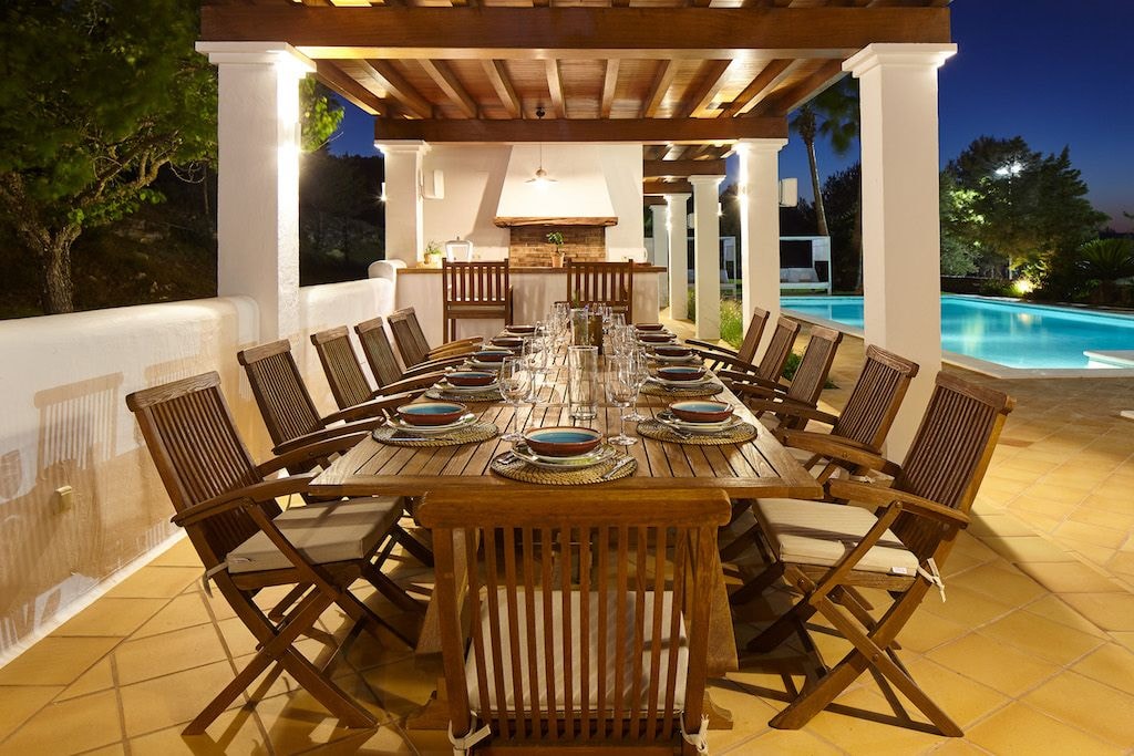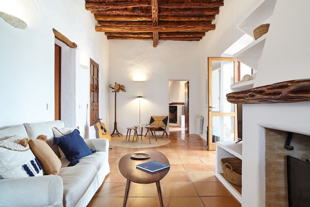 Das Haupthaus verfügt über sechs Schlafzimmer, die jeweils mit warmen Holzakzenten im traditionellen ibizenkischen Stil eingerichtet sind. Das separate Nebengebäude bietet drei weitere Schlafzimmer, sodass die Villa bequem Platz für bis zu siebzehn Gäste bietet. In beiden Gebäuden verbinden sich moderne Annehmlichkeiten mit rustikalem Charme. Eine Klimaanlage sorgt für angenehme Kühle in den Zimmern, während Annehmlichkeiten wie Satellitenfernsehen, WLAN und eine gut ausgestattete Küche Komfort ohne Kompromisse garantieren.