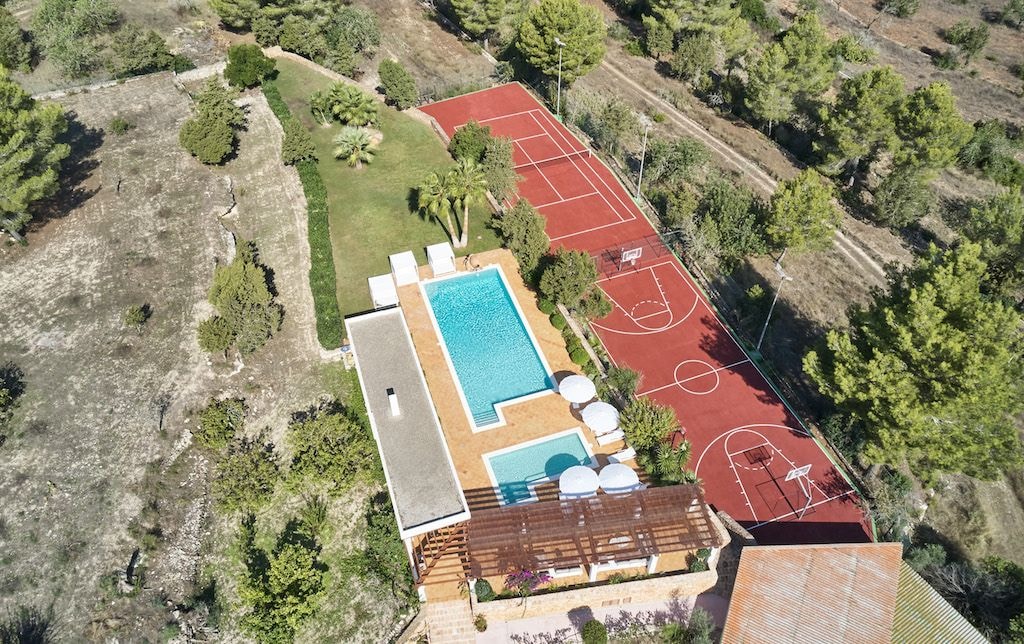Im Außenbereich entsprechen die Einrichtungen den großzügigen Proportionen der Villa. Ein großer Swimmingpool bildet das Herzstück, begleitet von einem Kinderbecken mit Whirlpool. Tennis- und Basketballplätze nehmen ihre eigenen Ecken des Grundstücks ein, während mehrere Essbereiche und Chill-out-Bereiche den Garten zieren. Zwei Außenbäder und ein Umkleideraum mit Dusche dienen dem Poolbereich, wo Sonnenliegen und Sonnenschirme Plätze zum Entspannen unter der Sonne Ibizas bieten.