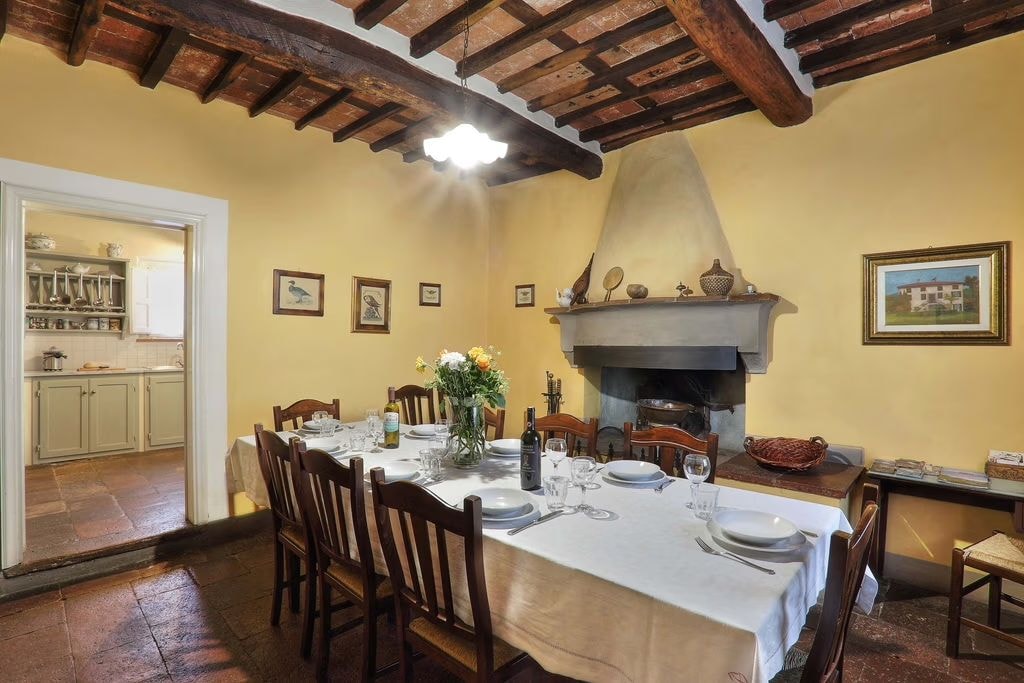Das Interieur des Bauernhauses verbindet traditionelle toskanische Elemente mit praktischen Modernisierungen. Die klimatisierten Schlafzimmer verteilen sich auf zwei Etagen, mit eigenem Bad im ersten Stock. Ein Schlafzimmer im Erdgeschoss ist für Gäste mit eingeschränkter Mobilität geeignet. Die gut ausgestattete Küche öffnet sich zu Wohnräumen, die ihren ursprünglichen Charakter bewahrt haben und gleichzeitig modernen Komfort bieten.