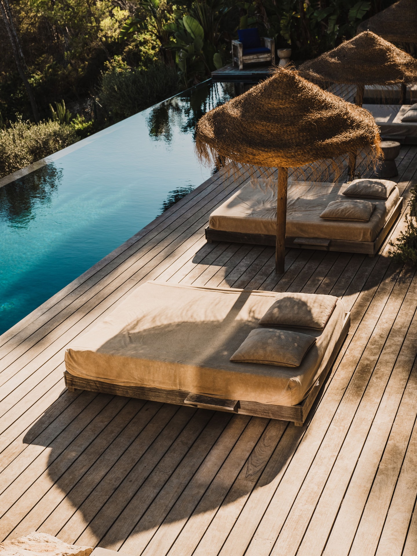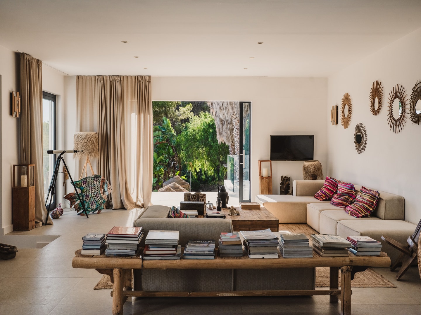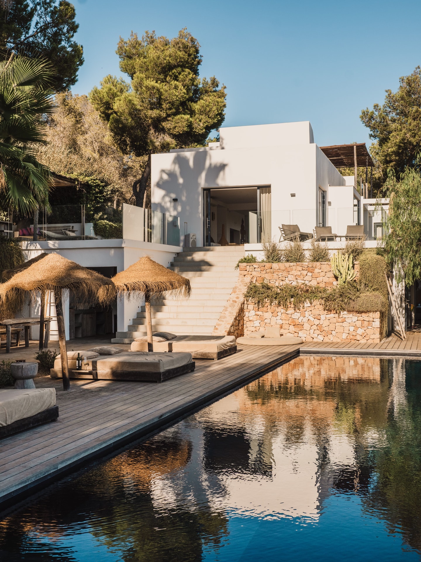 Der 18 Meter lange Infinity-Pool bietet einen Ausblick, der diese Lage auf einem Hügel auszeichnet. Olivenbäume säumen den Garten, ihre silbergrünen Blätter wiegen sich im Wind. Mehrere Strände sind leicht zu erreichen, während die Abgeschiedenheit echte Ruhe garantiert. Der Morgen kann mit einem Kaffee auf der Terrasse beginnen, der Nachmittag am Pool verbracht werden und der Abend damit, von diesem ruhigen Aussichtspunkt über dem Süden Ibizas aus zu beobachten, wie sich das Licht über dem Wasser verändert.