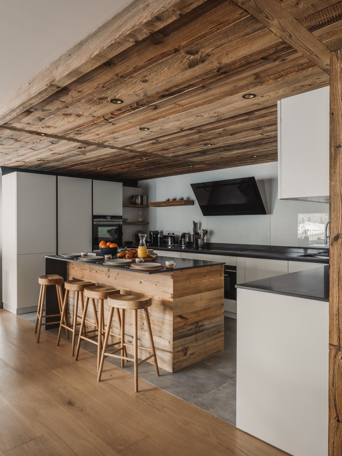 Im Eingangsbereich erwartet Sie eine praktische Garderobe für Ihre Winterausrüstung. Die Wohnung verfügt über einen großzügigen offenen Wohnbereich, in dem Küche, Esszimmer und Wohnzimmer miteinander verschmelzen. Zehn gepolsterte Stühle umgeben einen Esstisch aus Naturholz, während die Küche mit einer Frühstückstheke mit vier Hockern, zwei Backöfen und zwei Kühlschränken ausgestattet ist. Eine Nespresso-Maschine, ein Entsafter und moderne Geräte runden die Ausstattung ab.