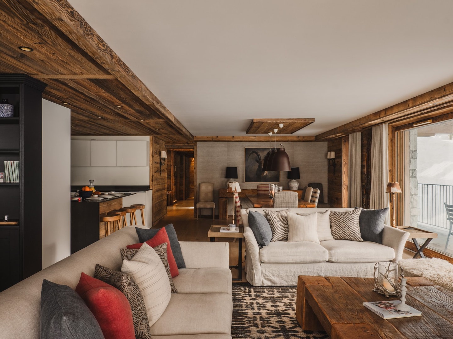 Fünf-Zimmer-Ski-Residenz im Rond Point in Val d'Isère, wo Sie Ihre Skier direkt vor der Haustür anschnallen und direkt nach Solaise oder Bellevarde gleiten können. Modernes Interieur mit flexiblen Schlafmöglichkeiten.