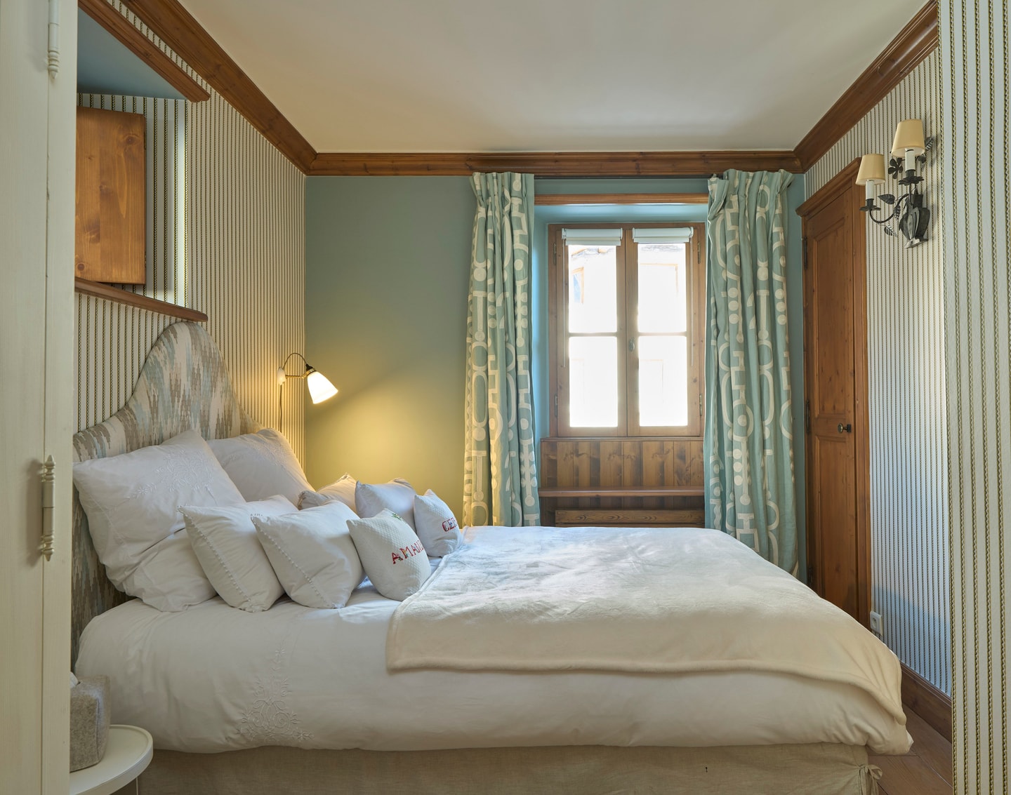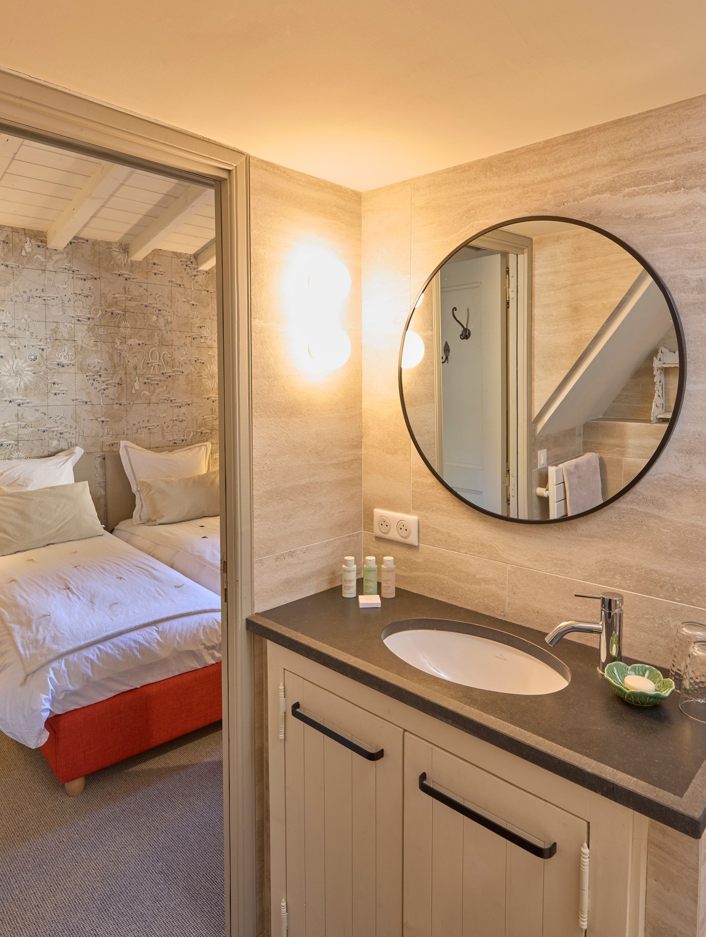 Vier separate Schlafzimmer bieten Flexibilität für verschiedene Gruppen. Das erste, das von der Küche aus zugänglich ist, verfügt über ein 140 cm breites Doppelbett und ein eigenes Duschbad mit WC. Das zweite verfügt über zwei Einzelbetten, die zu einem Doppelbett zusammengestellt werden können, ein eigenes Badezimmer mit Badewanne, jedoch ohne WC, und ein Zwischengeschoss mit zwei zusätzlichen Einzelbetten. Im Obergeschoss dient das dritte Zimmer als Kinderzimmer mit niedrigen Decken und zwei Einzelbetten, während das gegenüberliegende Hauptschlafzimmer über ein Duschbad und viel Stauraum verfügt und durch einen charmanten Balken geprägt ist. Ein separates WC befindet sich im Flur neben dem Hauptschlafzimmer.