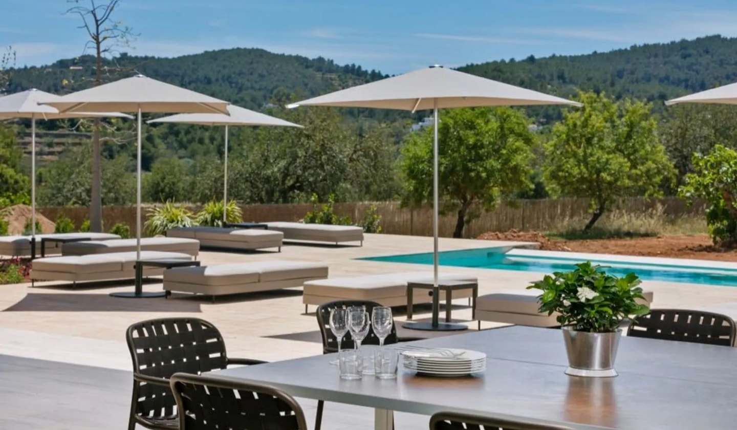 Between Santa Eulària and Santa Gertrudis, this modern villa offers sweeping views across the hills to the bay. Seven bedrooms, each with its own bathroom, provide space and privacy for everyone.