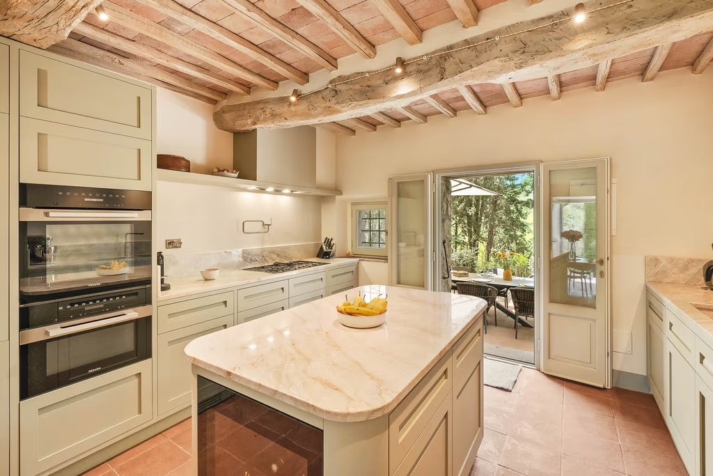 The interiors blend traditional Tuscan architecture with practical updates. Air conditioning keeps all bedrooms and the living room comfortable, while window screens throughout provide insect-free ventilation. The living and dining rooms connect through French doors to a furnished terrace. A well-equipped kitchen features KitchenAid appliances and a temperature-controlled wine fridge, ideal for storing local vintages.