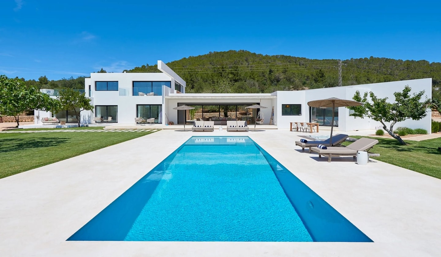 Eight bedrooms spread across 17,700 square metres of private land, just outside San Juan. This modern villa sits on a working farm, complete with fruit orchards, centenary olive trees and a restored water wheel that hints at the property's agricultural past. The northern beaches of Benirràs and its famous sunsets are fifteen minutes away by car.
