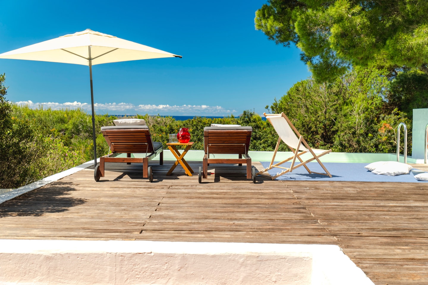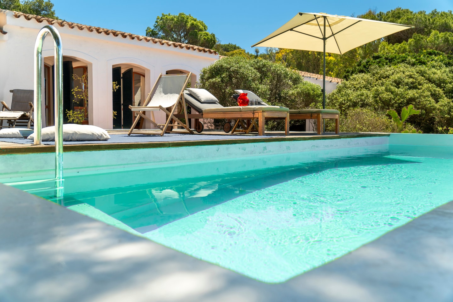 Traditional Sardinian architecture defines the interior, where simple seaside furnishings create an elegant, unfussy atmosphere. Each bedroom comes with its own private bathroom, and most open directly onto covered patios for complete privacy. The main covered terrace houses a dining area and large barbecue, perfect for long meals outdoors. A compact swimming pool occupies the deck terrace, positioned to make the most of those sea views. The pool can be fenced upon request for families with young children.