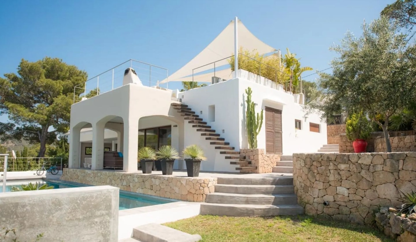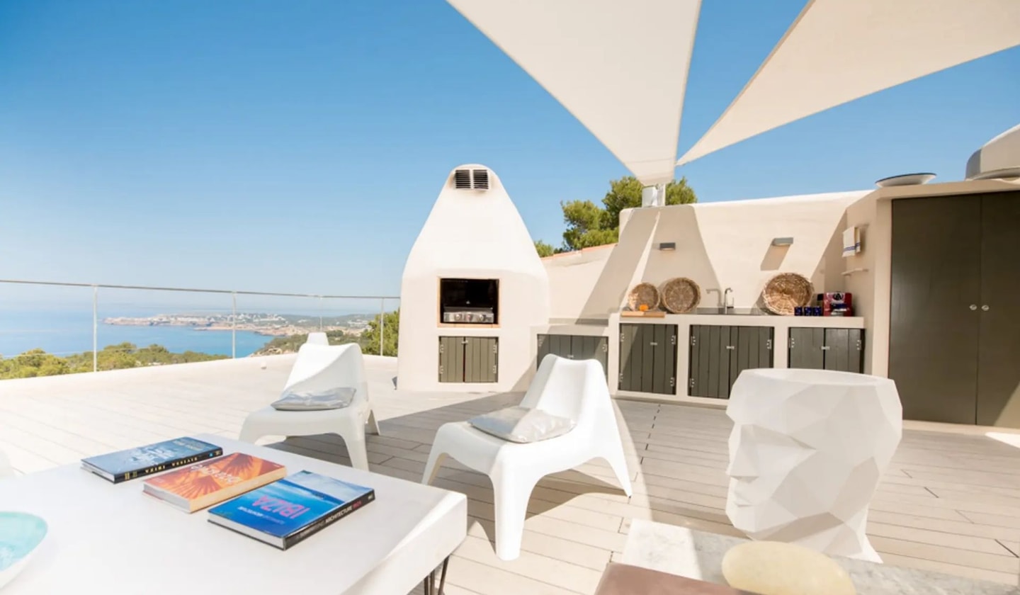 The nearest beach at Cala Moli requires a ten-minute walk down (and back up) the hillside. San José sits ten minutes away by car, with Cala Vadella's supermarket just five minutes' drive. Ibiza Town takes about twenty minutes. Air conditioning keeps all bedrooms cool, while Wi-Fi and various entertainment systems are available throughout. Cleaning service comes five times weekly, maintaining the house for families and quieter groups who book here.