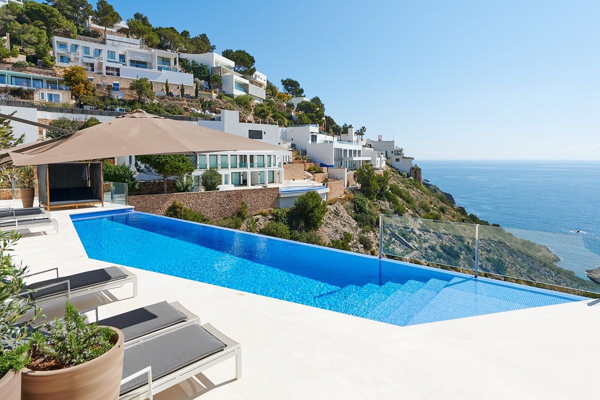 Modern villa carved into Roca Llisa's rocky coastline, where infinity pool and Mediterranean merge. Wake to endless blue horizons from your palm-fringed perch above the sea.