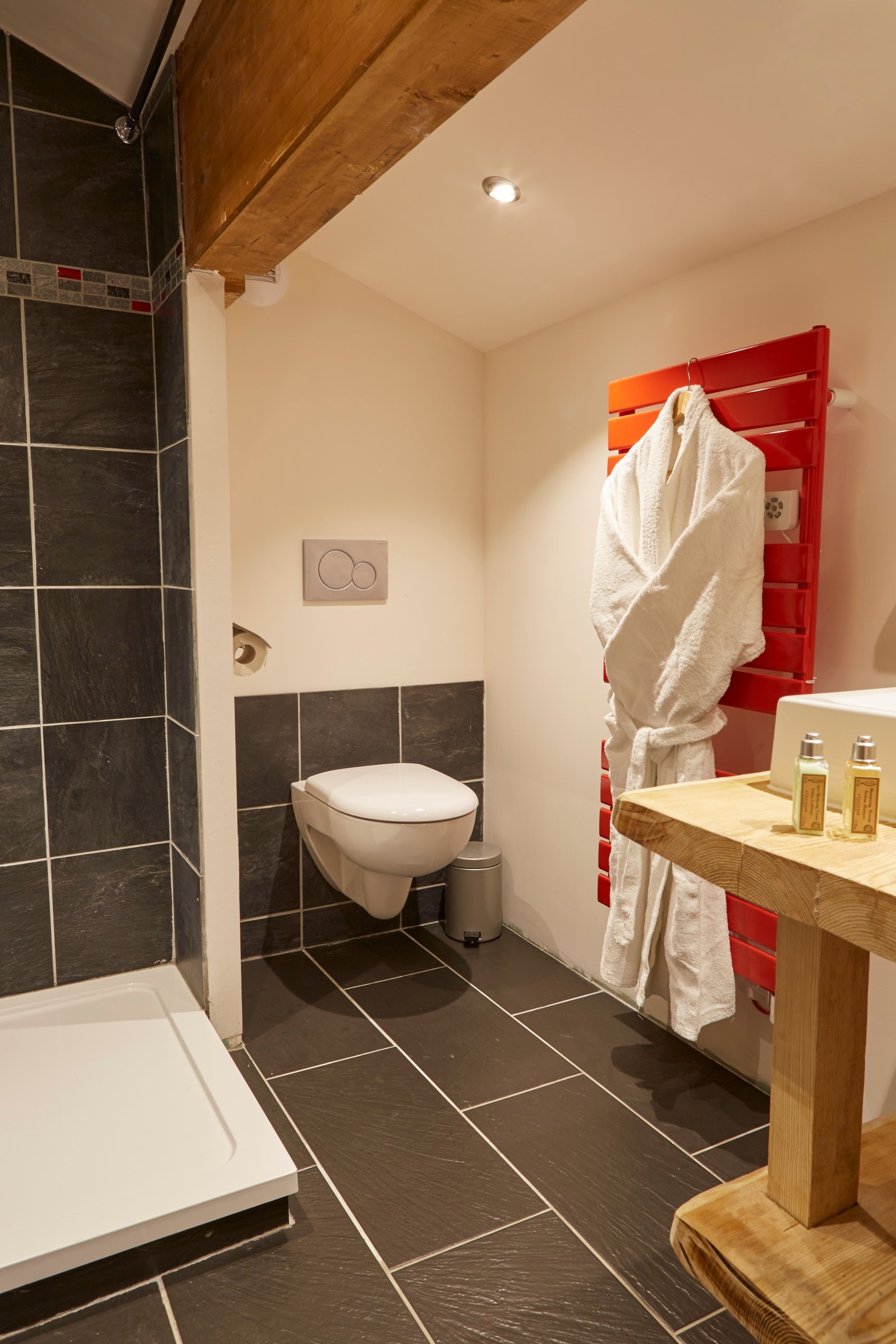 Three further bedrooms occupy the upper floor, each with its own bathroom. The ground floor suite features a queen bed and bathtub with shower attachment and glass panel, while upstairs you'll find two twin rooms with flexible bed arrangements and a queen double. Not that the middle room does not have a window. All bathrooms include heated towel rails, with a mix of bath and shower facilities throughout. The south-east facing balcony captures views across to Solaise and the Manchet Valley, adding outdoor space to this generously proportioned property.