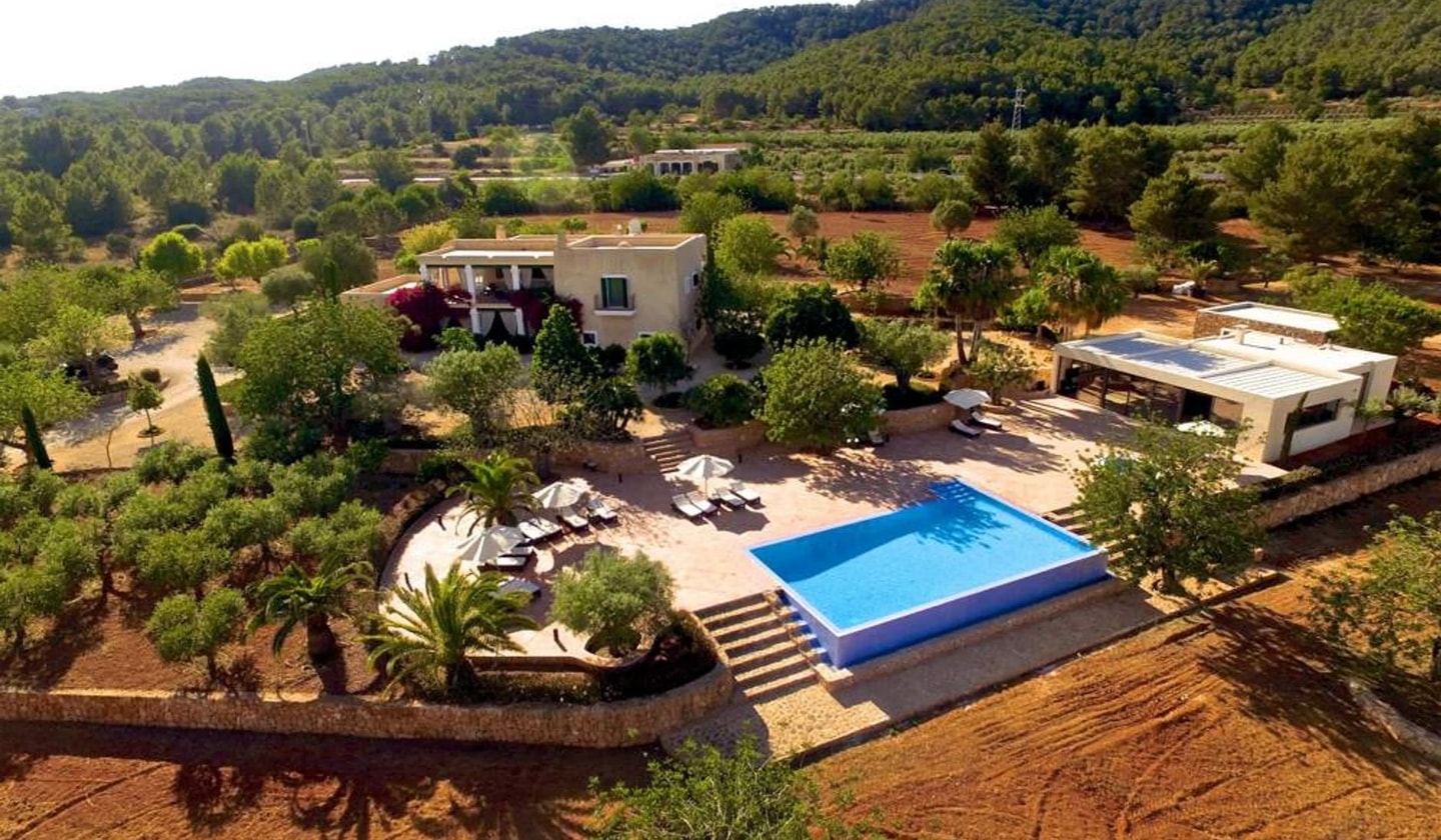 Between Santa Eulària and Santa Gertrudis, this eight-bedroom villa brings together Tuscan-inspired architecture with Ibiza's countryside charm. Views stretch across rolling hills to Santa Eulària bay.
