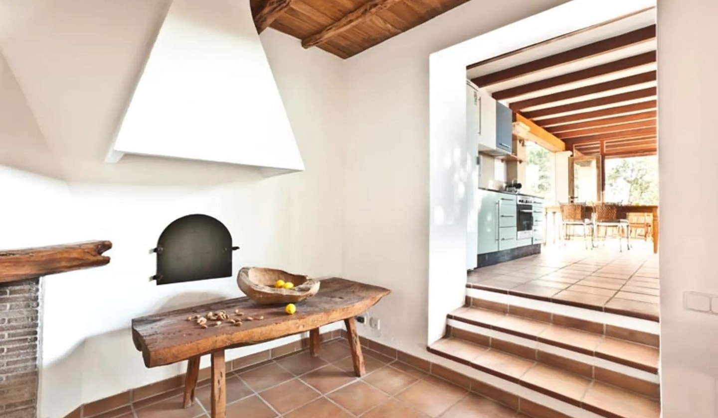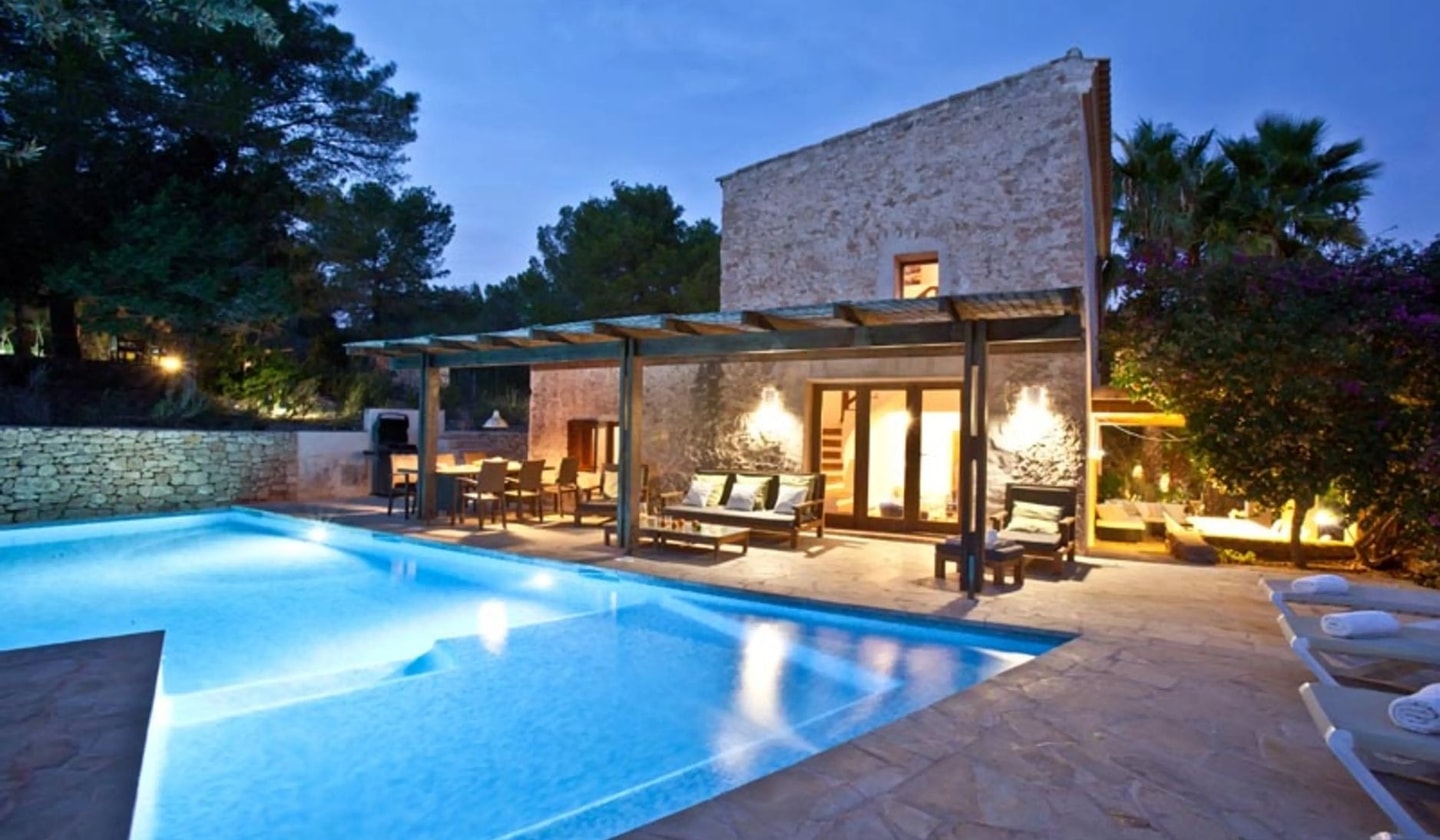 Mornings might begin with breakfast on the porch before heading to nearby Cala Bassa's turquoise waters. The tiered pool deck offers spots for reading in the shade or soaking up sun between dips. Evening barbecues happen poolside, with the outdoor music system setting the mood as sunset paints the sky. The property sleeps up to 11 guests comfortably across its various buildings.