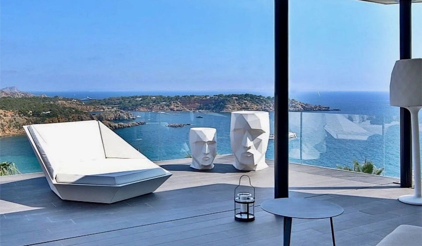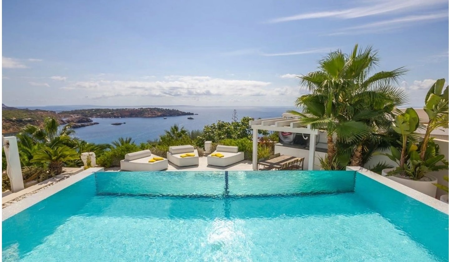 First-line luxury in Vista Alegre's gated enclave, this modernly furnished villa frames endless Mediterranean views from its southwest perch near Es Cubells. Three bedrooms, designer spaces, and year-round comfort.