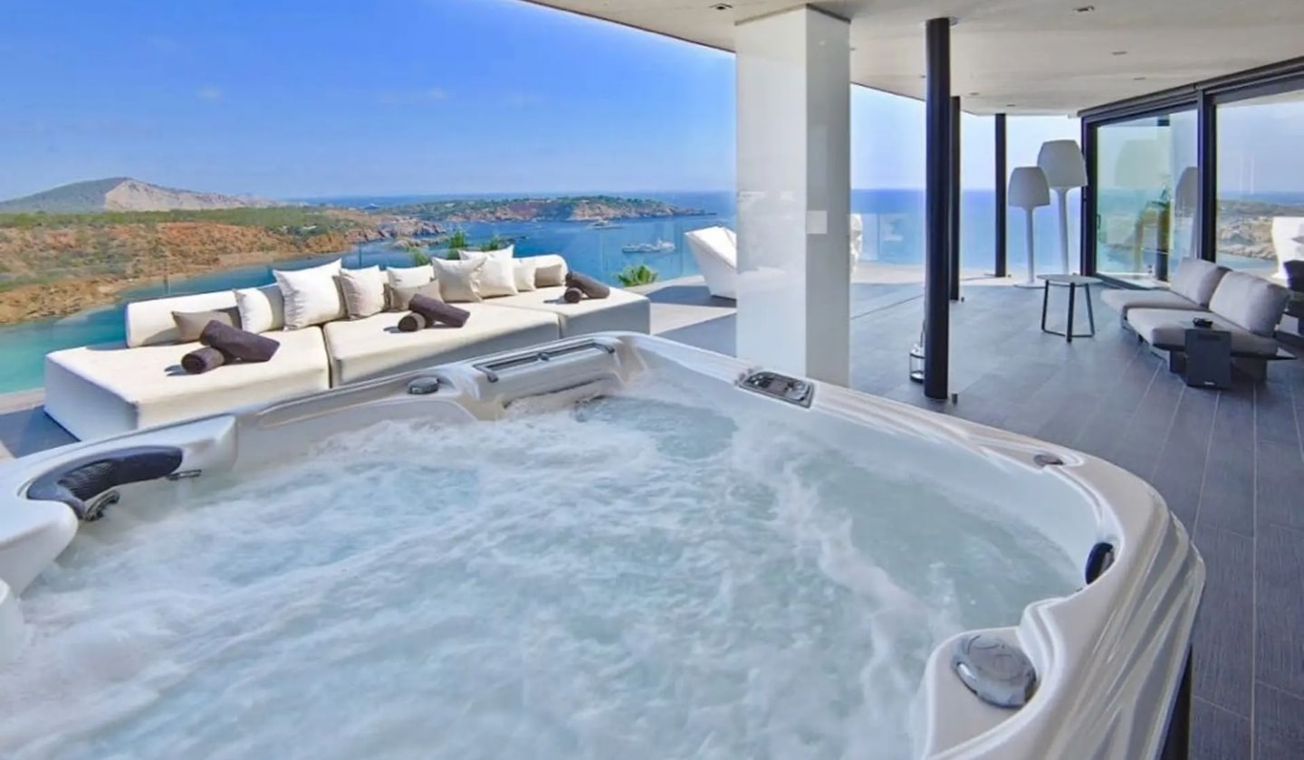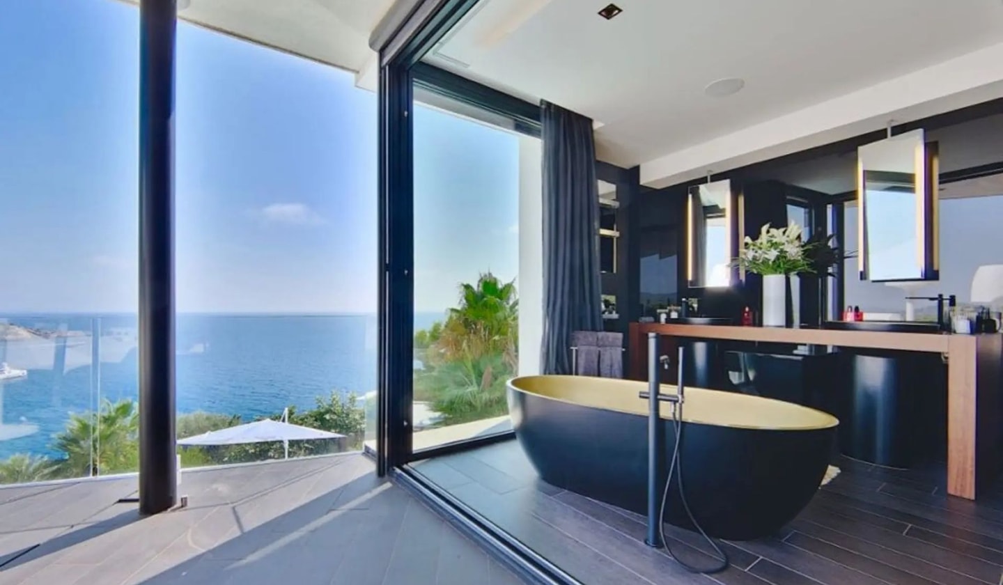 Upstairs, the master suite takes a distinctive approach with its round tatami bed positioned beneath a ceiling-mounted television. The en-suite bathroom here has been designed to frame Mediterranean views through its windows. Outside, a 6.2 by 4.3 metre saltwater pool forms the heart of the terrace areas. An outdoor kitchen with barbecue and bar sits alongside, while multiple dining and lounging spaces offer different vantage points across the property.
