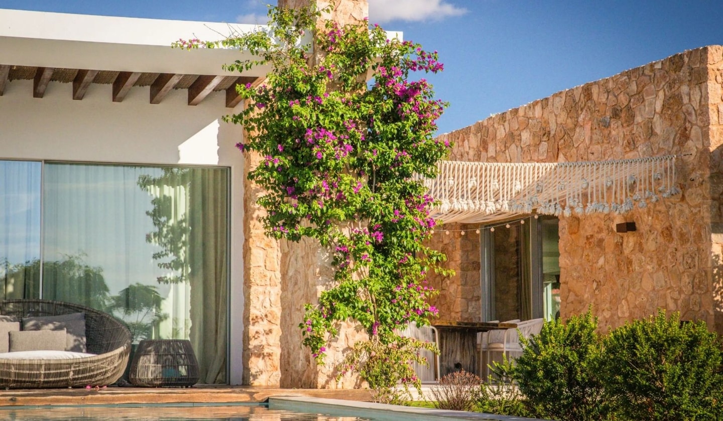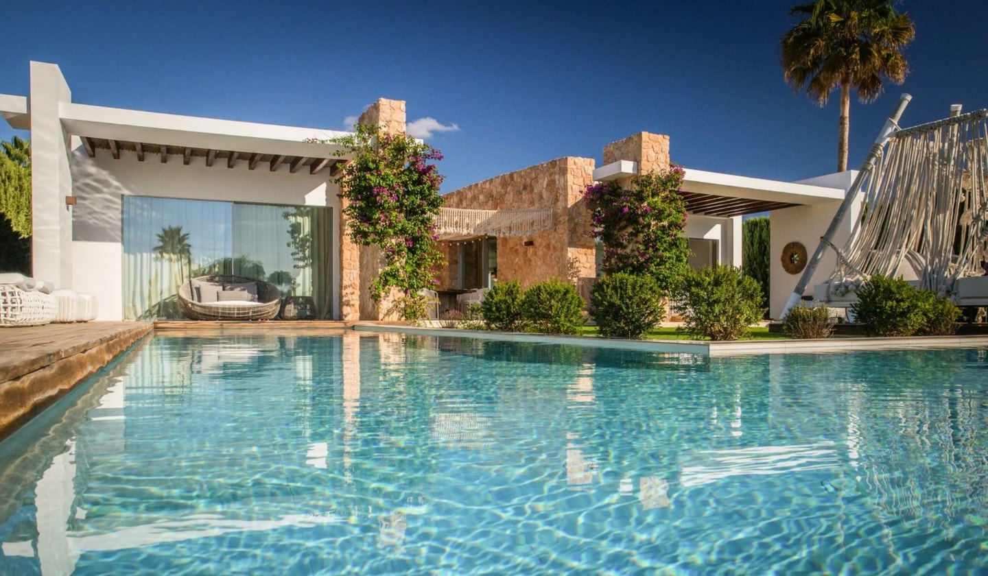 Four bedrooms and sea views just 400 metres from Cala Conta beach. An L-shaped pool stretches beside lawned gardens, while inside, spacious rooms open to each other with natural ease.