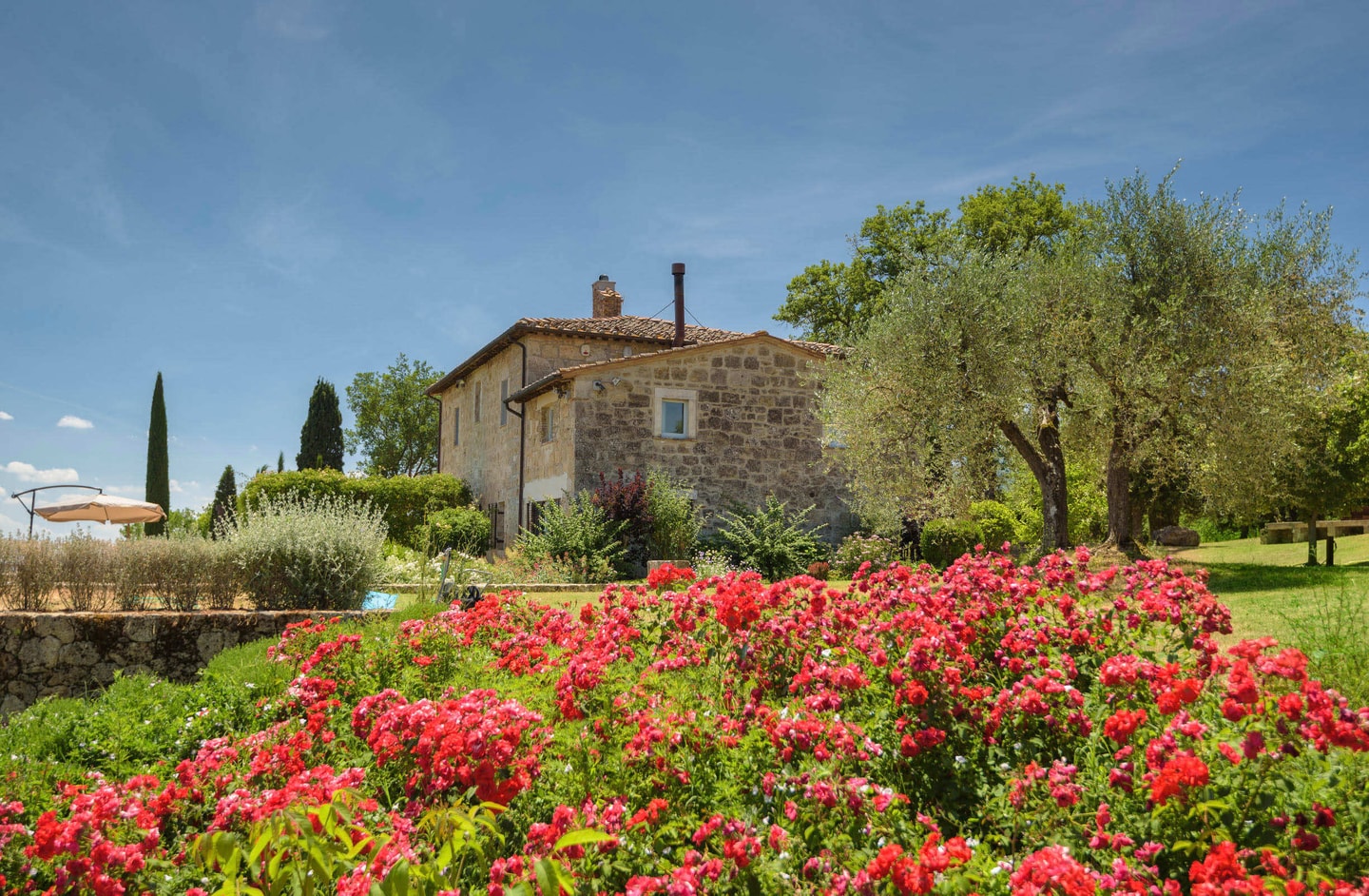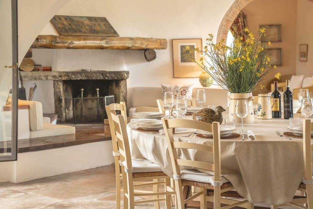 De boerderij ligt rond een binnenpatio waar een met wijnranken begroeide pergola schaduw geeft aan een marmeren eettafel. Openslaande deuren zorgen voor veel natuurlijk licht in de woonruimtes en geven direct toegang tot de tuin. Het interieur heeft traditionele Toscaanse elementen behouden, maar is comfortabeler gemaakt door doordachte details. Aan de voorkant van het huis zijn meerdere terrassen met meubilair waar je 's ochtends koffie kunt drinken of 's avonds een aperitief kunt nemen, elk met uitzicht over de vallei.