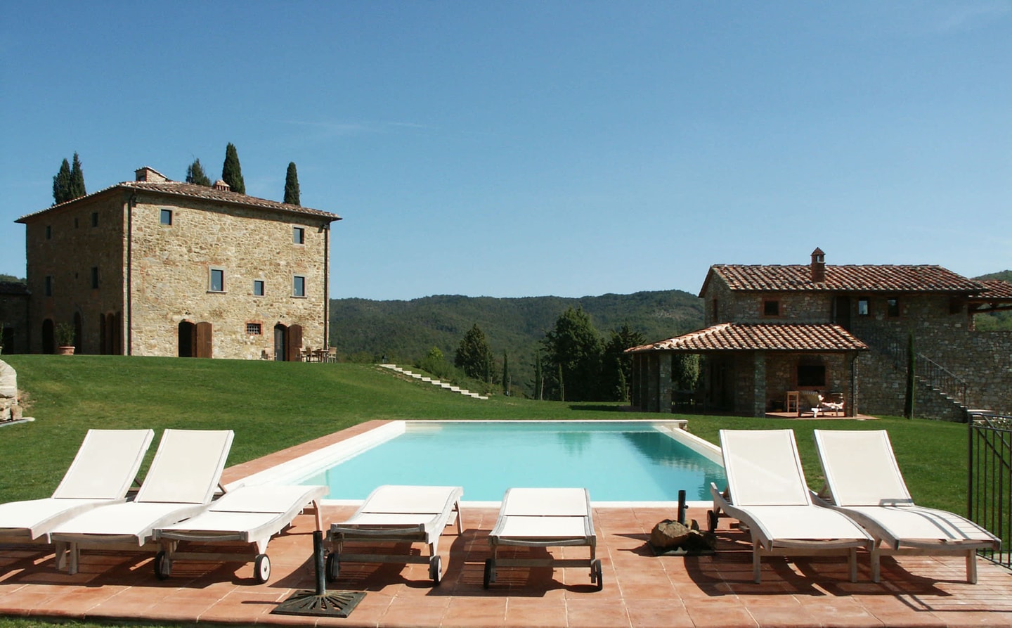 Gerestaureerde Toscaanse boerderij in het hart van Chianti Classico met panoramisch uitzicht over glooiend landschap. Terrassen en overloopzwembad nodigen uit om te genieten van het rustgevende ritme van het landelijke Italië.
