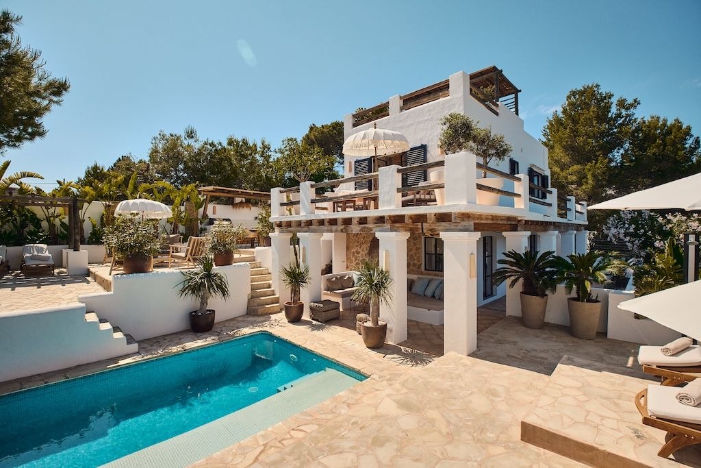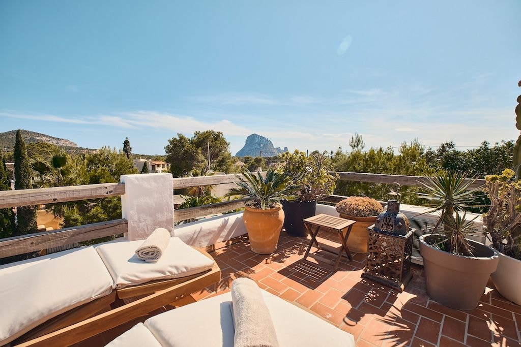Vier tweepersoonskamers met eigen badkamer en een keuken die zowel naar binnen als naar buiten opent, maken deze villa in Cala Carbó bijzonder geschikt voor groepen die zowel gezelligheid als privacy waarderen. Het terrein biedt een direct uitzicht op Es Vedrà, de opvallende rotsformatie die uit de zee oprijst, terwijl de westelijke ligging een eersteklas plek garandeert voor de beroemde zonsondergangen van Ibiza.