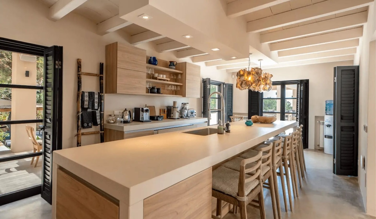 De belangrijkste leefruimte komt direct uit op de terrassen bij het zwembad, met in de verte het strand van Cala Jondal. Een open haard vormt het middelpunt van de woonkamer, terwijl de keuken is uitgerust met dubbele vaatwassers en alle apparatuur die je mag verwachten. Twee slaapkamers op de begane grond hebben een eigen badkamer, waarvan één met een bad. De indeling zorgt voor gezelligheid, maar biedt ook privacy wanneer dat nodig is.