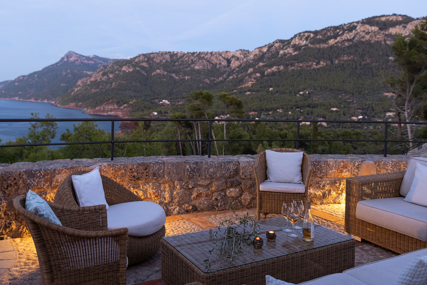 De dagen vullen zich hier moeiteloos met ontspannen bij het zwembad en uitstapjes langs de ongerepte kust van Noordwest-Mallorca. In de omgeving vind je stille baaitjes, wandelroutes langs kliffen en dorpjes met authentieke restaurants en lokale markten. Tegen de avond wordt het terras het middelpunt, waar het diner doorgaat tot ver na zonsondergang, terwijl de lucht boven zee langzaam van kleur verandert.