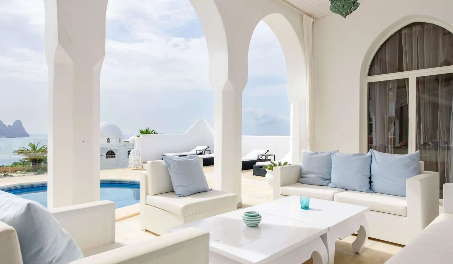 Een Marokkaans geïnspireerde villa met uitzicht op Es Vedrà, waar oosterse charme en Ibizaanse schoonheid samenkomen. Zeven slaapkamers met de magie van Arabian Nights, op een steenworp afstand van het strand van Cala Carbó.
