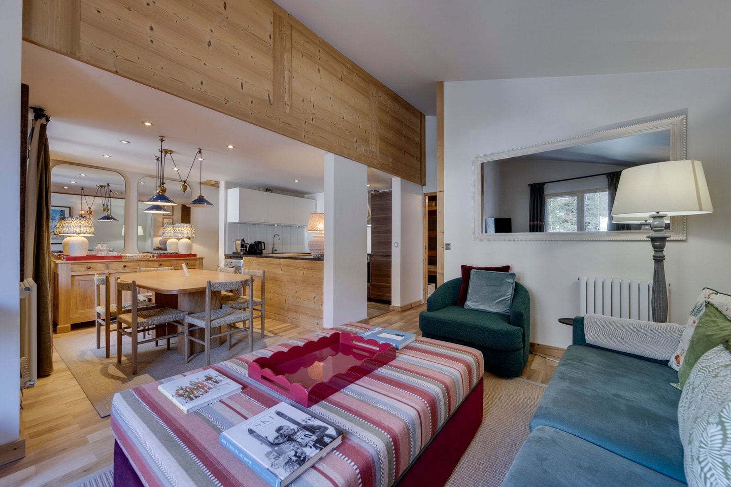 De hal zet de toon voor de rest van het appartement, met een bank met opbergruimte voor skischoenen en winteruitrusting. Vanuit de hal strekken de belangrijkste leefruimtes zich uit naar rechts, met slaapkamers aan de linkerkant voor privacy. De keuken is voorzien van granieten werkbladen, stenen vloeren, een vierpits elektrische kookplaat, een oven van normale grootte, een magnetron en een vaatwasser, plus een ruime koelkast met vriesvak voor langere verblijven.