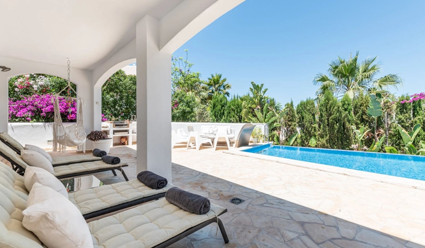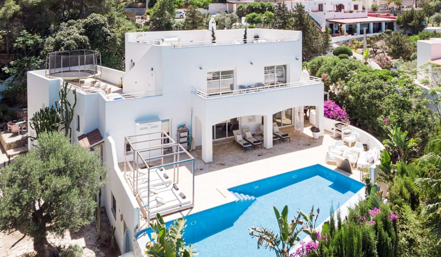 Een stijlvolle villa verscholen boven Santa Eulària, waar zes slaapkamers in twee gebouwen ruimte bieden voor iedereen. Interieurontwerperdetails gaan hand in hand met uitzicht op het infinity zwembad.