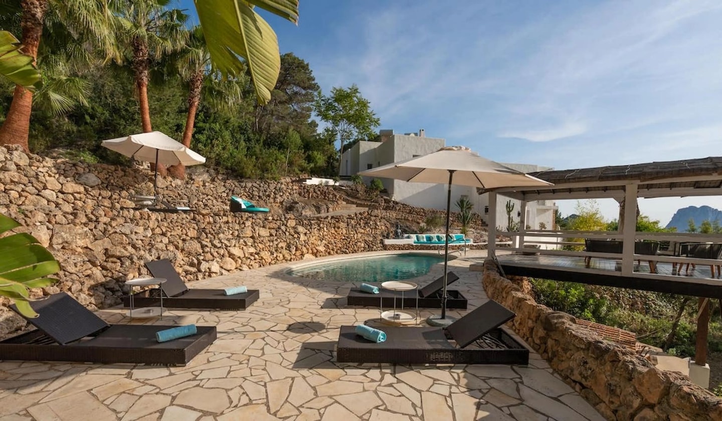 Hoog boven Cala d’Hort omlijst deze designvilla Es Vedrà met terrasvormige lounges en zwembaden bij zonsondergang. Vier slaapkamers, verdeeld over verschillende niveaus, bieden uitzicht op de baai en een stijlvol, modern interieur.