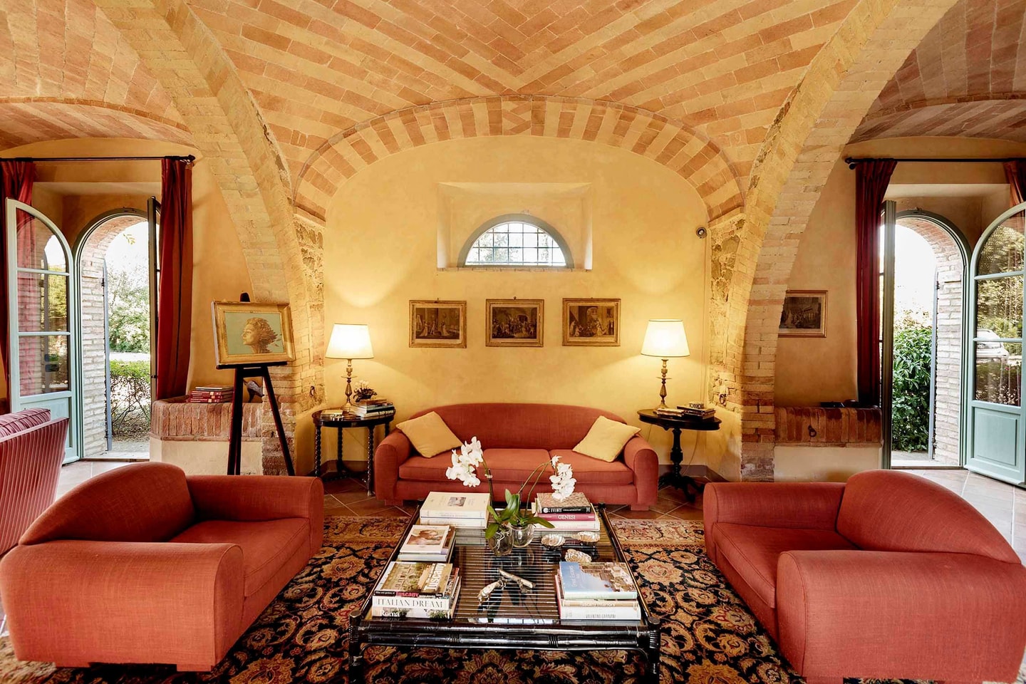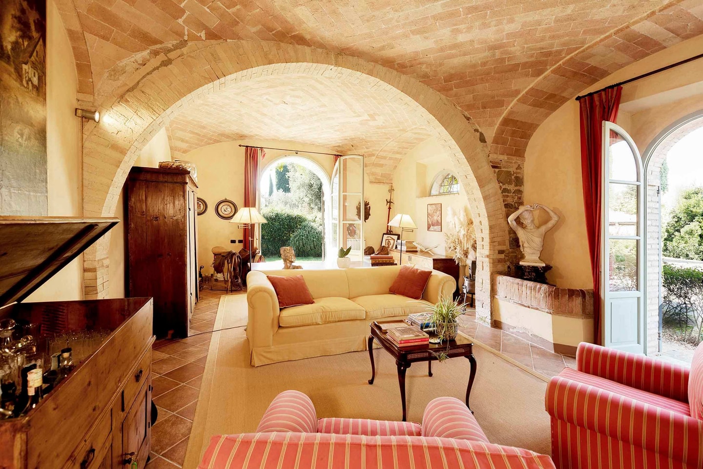 De U-vormige villa ligt rondom een centrale binnenplaats en biedt intieme ruimtes om samen te komen en rustige hoekjes om je even terug te trekken. De originele terracotta vloeren en gewelfde plafonds zijn overal behouden gebleven, terwijl antieke meubels elke kamer extra karakter geven. Op de begane grond vind je een ruime woonkamer met open haard, keuken en eetkamer die uitkomen op de binnenplaats, plus een slaapkamer met eigen badkamer. Boven vind je nog meer woonruimtes en vier extra slaapkamers, elk met een eigen badkamer.